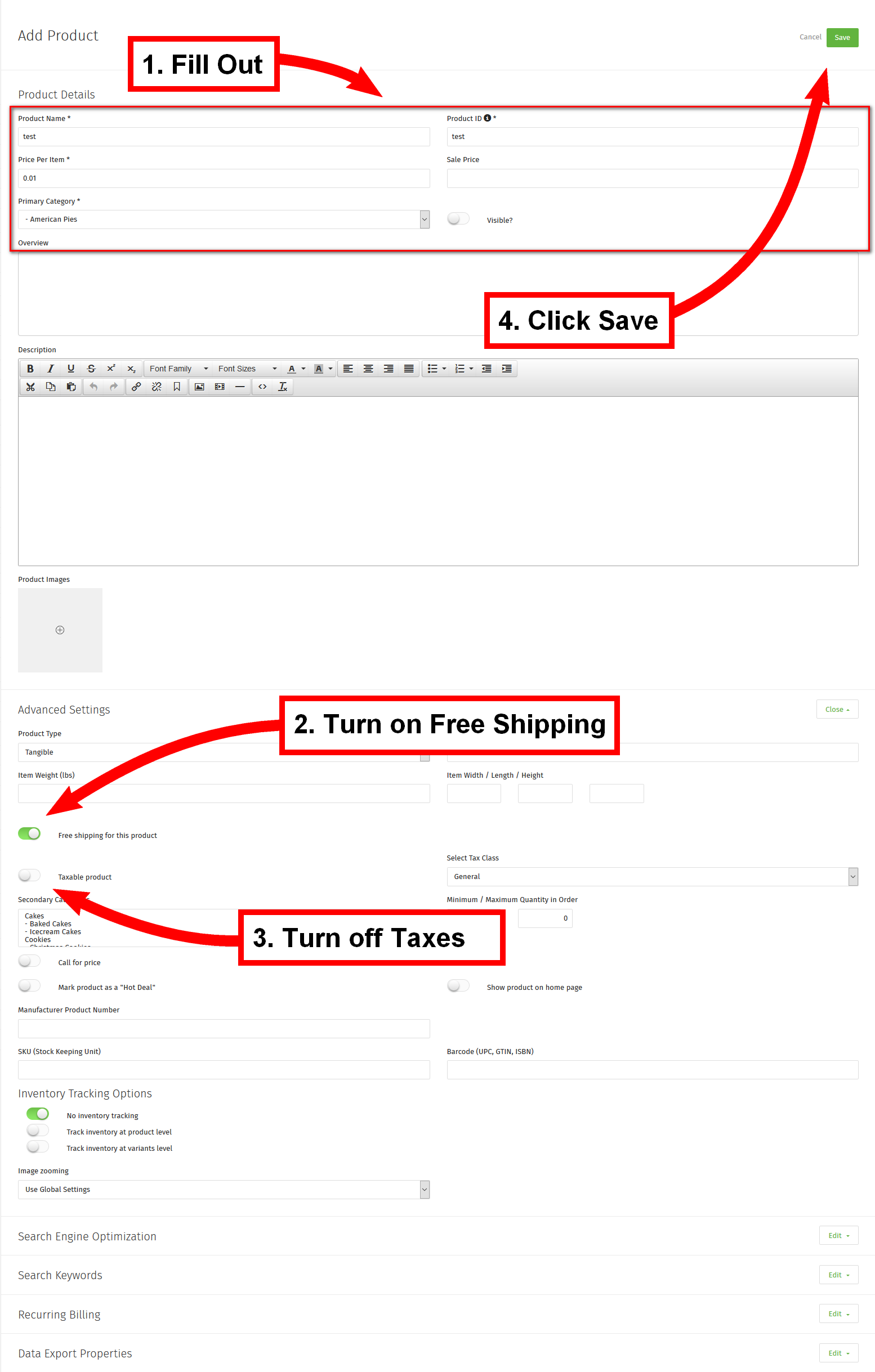For Product Name and Product ID, use Test. For Price, use 0.01 (1 cent), and select a random category.